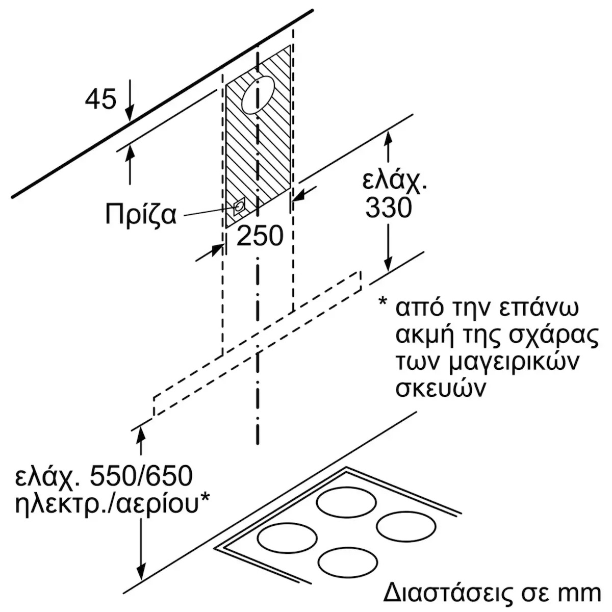 • Ελάχιστη απόσταση από ηλεκτρικές εστίες: 550 mm