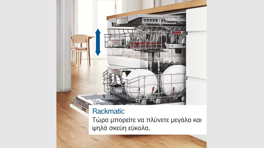 Χάρη στο τριπλό σύστημα Rackmatic, το ύψος του πάνω καλαθιού μπορεί να ρυθμιστεί εύκολα έως και κατά 5 cm. Και αυτό μπορείτε να το κάνετε ακόμα κι όταν είναι εντελώς γεμάτο. Αυτό σημαίνει ακόμα περισσότερες επιλογές ρύθμισης και, κατά συνέπεια, μέγιστη ευελιξία.