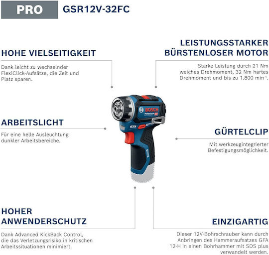 Το Bosch PRO GSR12V‑32 FC είναι ένα εξαιρετικά ευέλικτο και ασφαλές επαναφορτιζόμενο δραπανοκατσάβιδο 12 V, σχεδιασμένο για επαγγελματική χρήση σε στενούς χώρους και απαιτητικές εφαρμογές. Διαθέτει Advanced KickBack Control, μια τεχνολογία που μειώνει τον κίνδυνο τραυματισμού σε περίπτωση που η μύτη του τρυπανιού μπλοκάρει ξαφνικά ή όταν η ροπή αυξάνεται αργά, παρέχοντας μεγαλύτερη ασφάλεια στον χρήστη.