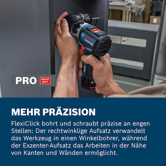 Η καινοτόμος σχεδίαση του με Bosch Professional FlexiClick System επιτρέπει την εύκολη αλλαγή εξαρτημάτων για διάτρηση και βίδωμα, καθιστώντας το εργαλείο πολύ πιο ευέλικτο. Με τα κατάλληλα εξαρτήματα, το εργαλείο μπορεί να μετατραπεί σε SDS plus περιστροφικό πιστολέτο (PRO GFA12-H) για διάτρηση σε σκυρόδεμα έως Ø10 mm, σε γωνιακό δραπανοκατσάβιδο (PRO GFA12-W) ή σε excenter attachment (PRO GFA12-E) για ακριβή εργασία κοντά σε άκρα και τοίχους. Τα εξαρτήματα μπορούν να κλειδωθούν σε 16 διαφορετικές θέσεις με γωνία 360° χωρίς να αφαιρεθούν από το εργαλείο.
