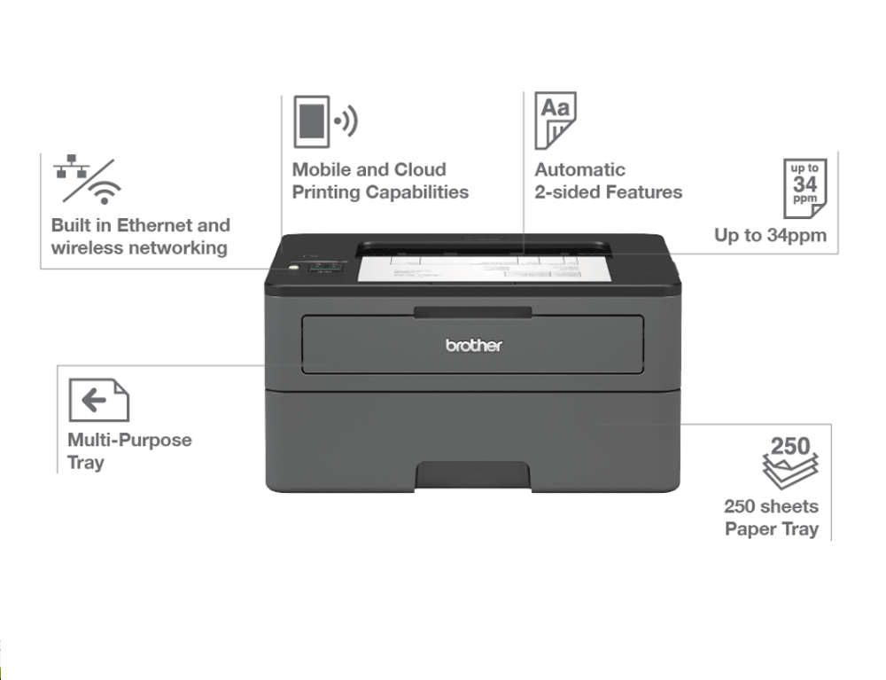 Διαθέτει πλήθος λειτουργιών εξοικονόμησης χρόνου, όπως γρήγορες ταχύτητες εκτύπωσης, δίσκο χαρτιού μεγάλης χωρητικότητας και αυτόματη εκτύπωση 2 όψεων, εξασφαλίζοντας ότι δεν θα περιμένετε πολύ για ένα σημαντικό έγγραφο.