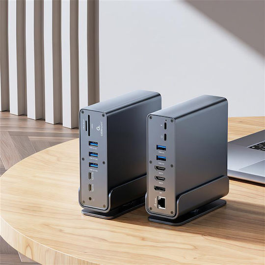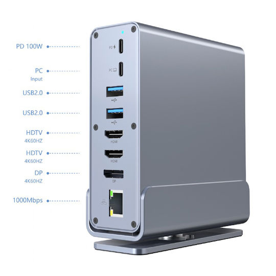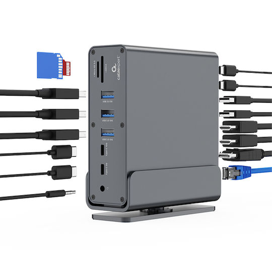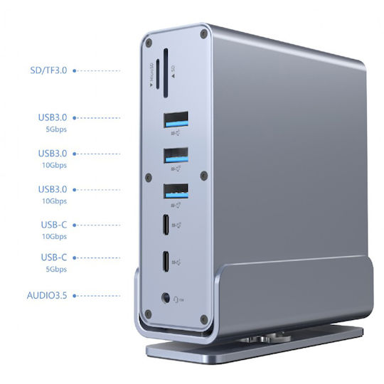 • Όλα σε Ένα: USB hub, HDMI x2, DisplayPort, USB Type-C PD για φόρτιση, card reader, Gigabit LAN, 3.5mm audio.