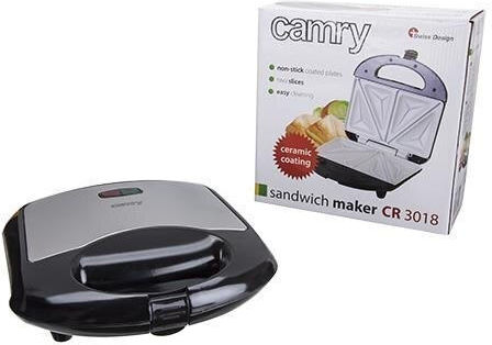 Ο τοστιέρα Camry CR 3018 έχει ισχύ 700 W και επιτρέπει την ταυτόχρονη παρασκευή 2 σандwich, τα οποία χωρίζονται σε 4 τρίγωνα κομμάτια. Διαθέτει ειδική λευκή κεραμική επικάλυψη στις πλάκες ψησίματος που αποτρέπει την προσκόλληση, διευκολύνοντας τον καθαρισμό της συσκευής.