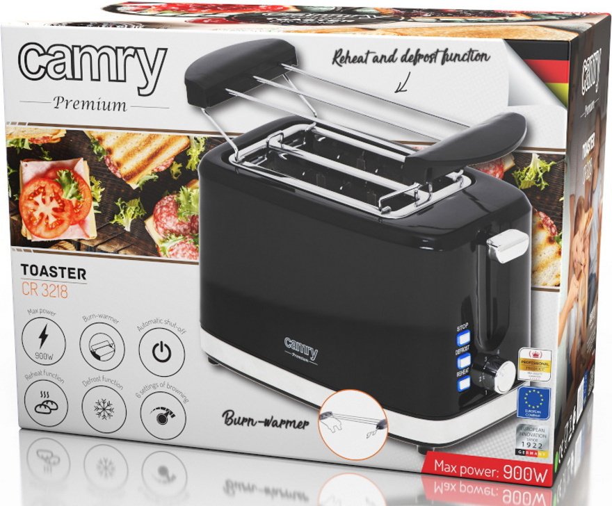 Φρυγανιέρα Camry CR 3218, 900W, για 2 φέτες, 6 ρυθμίσεις, αυτόματη απενεργοποίηση, Μαύρη