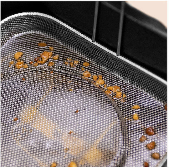 Η φριτέζα, περιλαμβάνει φίλτρο καθαρισμού του λαδιού για να διατηρείται το λάδι καθαρό μετά από κάθε χρήση. Το καπάκι είναι αφαιρούμενο και διαθέτει παράθυρο για να διευκολύνει τον έλεγχο της διαδικασίας τηγανίσματος καθώς και φίλτρο κατά των οσμών για αποφυγή ενόχλησης στην κουζίνα.
