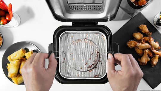 Η φριτέζα περιλαμβάνει ένα πρωτοποριακό φίλτρο OilCleaner, το οποίο επιτρέπει να διατηρείτε το λάδι καθαρό για μεγαλύτερο χρονικό διάστημα, επεκτείνοντας την ωφέλιμη ζωή του. Για να καθαρίσετε το λάδι, απλά ανασηκώστε το φίλτρο και αφαιρέστε τα υπολείμματα που εναποτίθενται σε αυτό, αφού ολοκληρωθεί η διαδικασία τηγανίσματος. Ένας εύκολος και απλός τρόπος για να αφαιρέσετε τις ακαθαρσίες από το λάδι για να μπορείτε να το χρησιμοποιήσετε ξανά όποτε θέλετε.