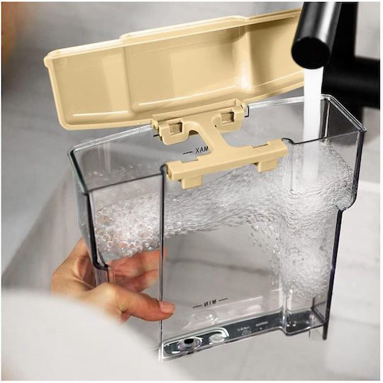 Η δεξαμενή χωρητικότητας 1.5 λίτρου προσφέρει αρκετά φλιτζάνια πριν χρειαστεί να γεμίσεις ξανά, εξασφαλίζοντας πρακτικότητα και άνεση στην καθημερινή χρήση. Ο αποσπώμενος δίσκος αποστράγγισης καθιστά τον καθαρισμό παιχνιδάκι, ενώ μπορείς να τοποθετήσεις φλιτζάνια μεγαλύτερου μεγέθους.