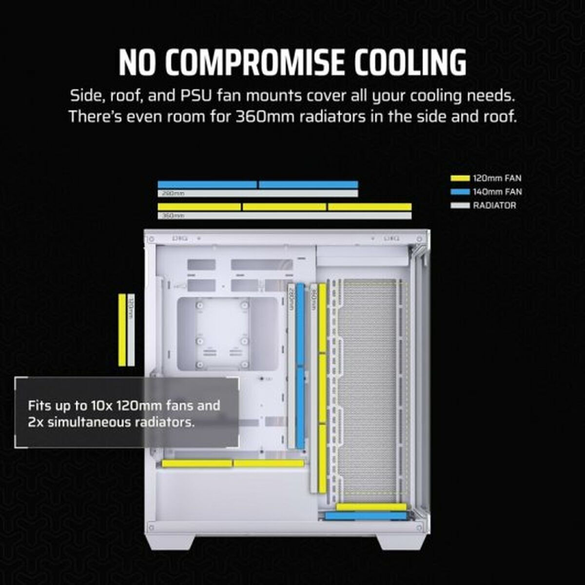 Η ισχυρή ψύξη είναι υψίστης σημασίας για έναν σύγχρονο υπολογιστή, και ο 3500X υπερέχει με πλαϊνές βάσεις ανεμιστήρων, βάσεις οροφής και βάσεις ανεμιστήρων τροφοδοτικού, ώστε να μπορείτε να καλύψετε όλες τις γωνίες. Και με σημεία τοποθέτησης ψυγείων 360 mm στο πλάι και στην οροφή, θα έχετε πολλές δυνατότητες για υγρή ψύξη.