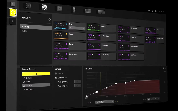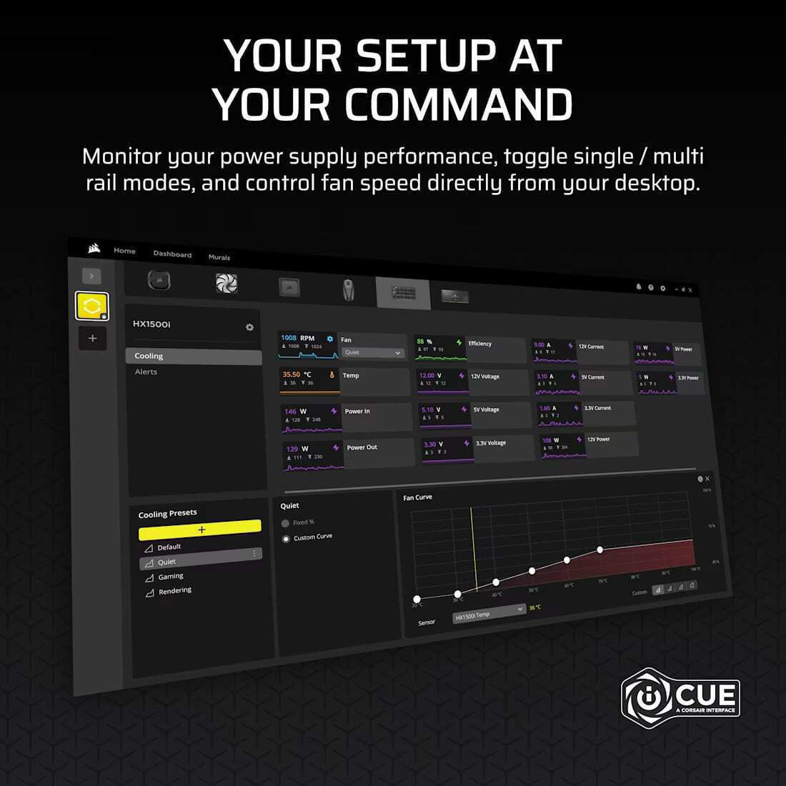 Με το λογισμικό CORSAIR iCUE, μπορείτε να παρακολουθείτε την απόδοση του τροφοδοτικού σας, να εναλλάσσετε τη λειτουργία single rail ή multi rail και να ελέγχετε την ταχύτητα του ανεμιστήρα απευθείας από την επιφάνεια εργασίας σας.