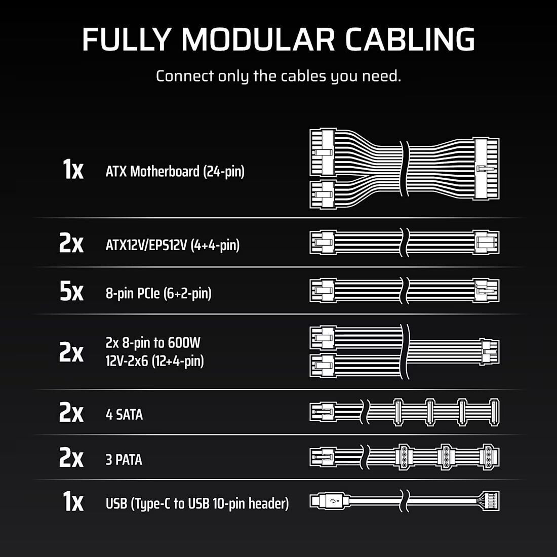 Με διπλά καλώδια 12V-2×6 και πλήρως αρθρωτή καλωδίωση, τα τροφοδοτικά πλατίνας της σειράς HXi έχουν κάθε σύνδεση που απαιτείται για να τροφοδοτήσουν τις πιο απαιτητικές αναβαθμίσεις υπολογιστών σήμερα και στο μέλλον, συμπεριλαμβανομένης της τελευταίας γενιάς καρτών γραφικών και επεξεργαστών που απαιτούν ενέργεια.