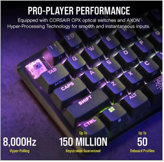 Η απόδοση των επαγγελματιών παικτών έρχεται σε μέγεθος 65% που εξοικονομεί χώρο. Οι οπτικοί διακόπτες CORSAIR OPX συνδυάζονται με ικανοποιητική ακουστική για να εστιάσετε σε αυτό που πραγματικά έχει σημασία: το παιχνίδι.