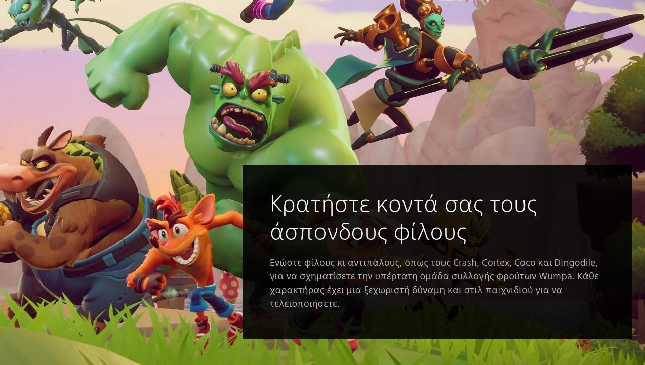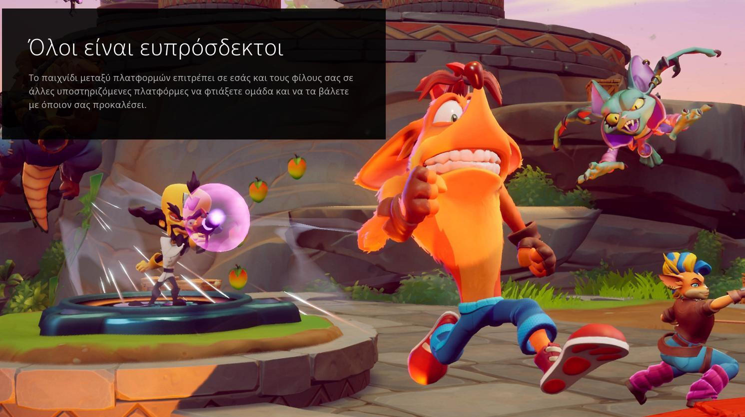 Ήρωες και κακοί από το σύμπαν του Crash συγκρούονται σε αυτό το παλαβό, διαδικτυακό παιχνίδι πολλών παικτών 4v4 από την Toys for Bob, την ίδια ομάδα που σας έφερε το Crash Bandicoot 4: It’s About Time.