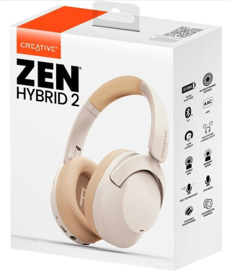 Creative Zen Hybrid 2 Ασύρματα / Ενσύρματα Over Ear Ακουστικά με 67 ώρες Λειτουργίας και Quick Charge Cream