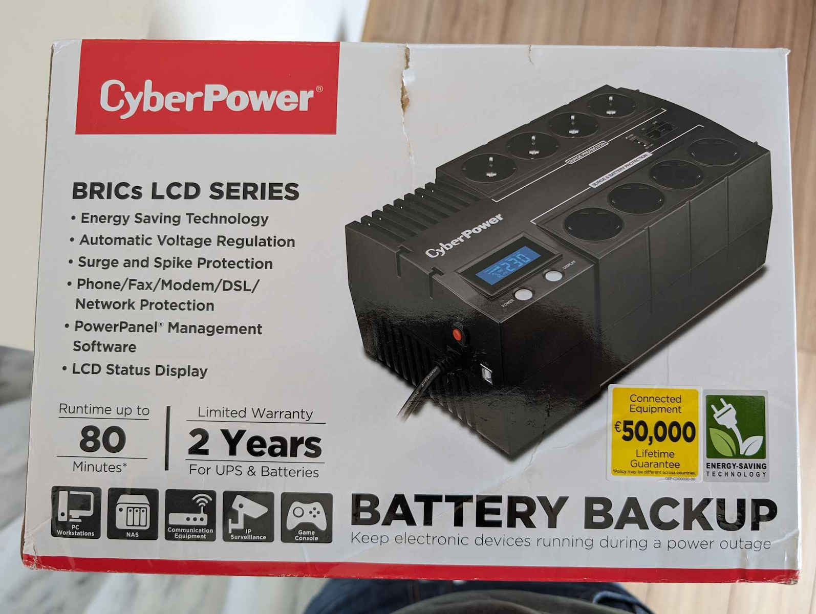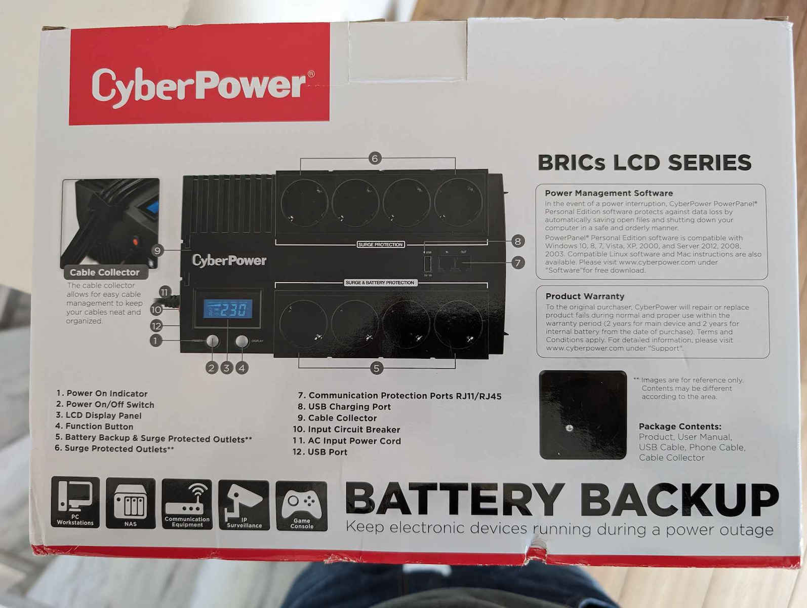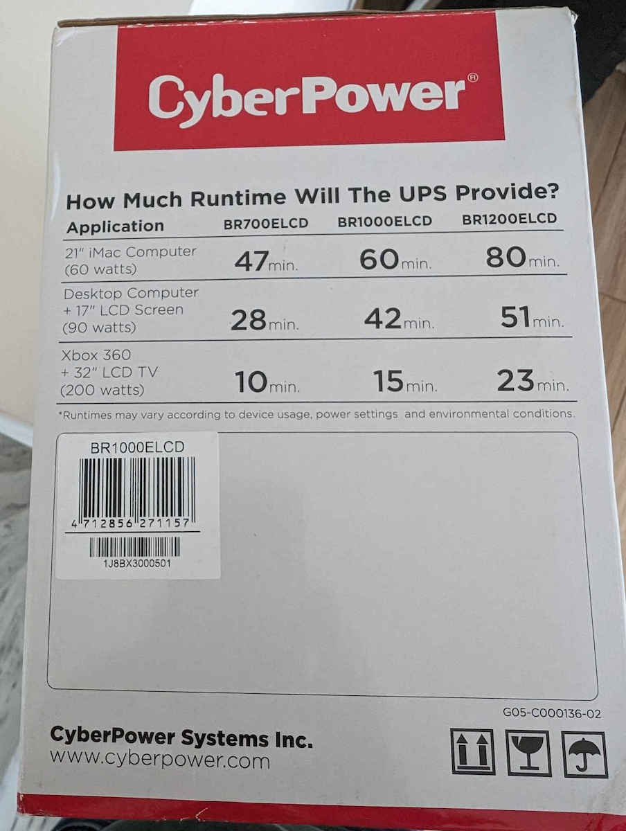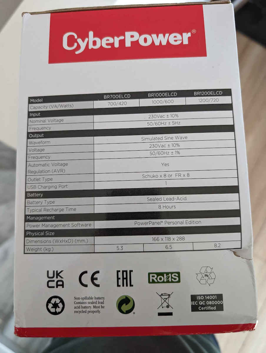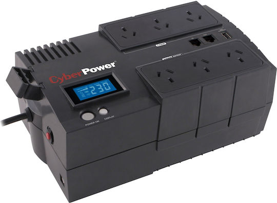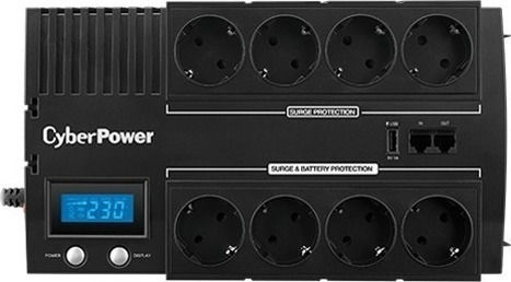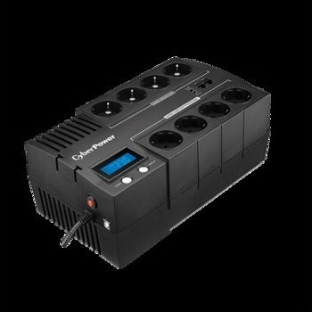 Το BR1000ELCD UPS Line-Interactive 1000VA 600W με 8 Schuko Πρίζες της CyberPower είναι ένα Compact UPS. Διαθέτει 8 πρίζες τύπου Schuko καθώς και υποδοχή και έξοδο για καλώδιο ethernet και για καλώδιο τηλεφώνου, προστατεύοντας τις συσκευές που συνδέονται με αυτό π.χ. router ή τηλέφωνο (εφόσον είναι συνδεδεμένη και η τροφοδοσία τους σε UPS ή πολύπριζο ασφαλείας). Η λειτουργία του είναι (VI) Line-Interactive που προσαρμόζει την τάση εξόδου συνεχώς μέσω αυτόματου ρυθμιστή τάσης προστατεύοντας από αυξομειώσεις της τάσης και διακοπές του ρεύματος. Η μπαταρία του μπορεί να κρατήσει 6 λεπτά με μισό φορτίο ή 1 λεπτό με πλήρες φορτίο (όταν οι συσκευές που είναι συνδεδεμένες τραβάνε το μισό ή το μέγιστο ρεύμα που μπορεί να δώσει το UPS αντίστοιχα).