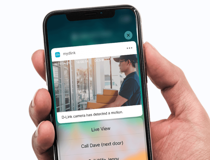 Οι ειδοποιήσεις push σάς επιτρέπουν να βλέπετε όσα συμβαίνουν στο χώρο και σας δίνουν την επιλογή να επιλέξετε ενέργειες όπως να δείτε live προβολή ή να καλέσετε έναν γείτονα, χωρίς να ξεκλειδώσετε το τηλέφωνό σας και να συνδεθείτε στο mydlink™ app.