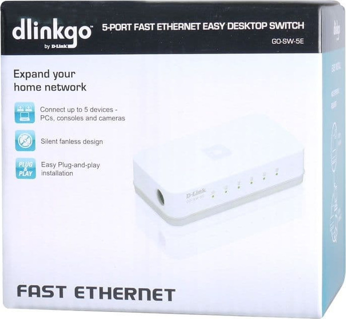 Το D-Link GO-SW-5E 5-Port Fast Ethernet Easy Desktop Switch σας επιτρέπει να εγκαταστήσετε ένα γρήγορο, αξιόπιστο και αποτελεσματικό ενσύρματο δίκτυο στο σπίτι ή το γραφείο σας. Συνδέστε το GO-SW-5E σε πολλούς υπολογιστές που διαμοιράζονται αρχεία και φακέλους ή συνδέστε το σε ένα δρομολογητή, για διαμοιρασμό μιας σύνδεσης Internet.