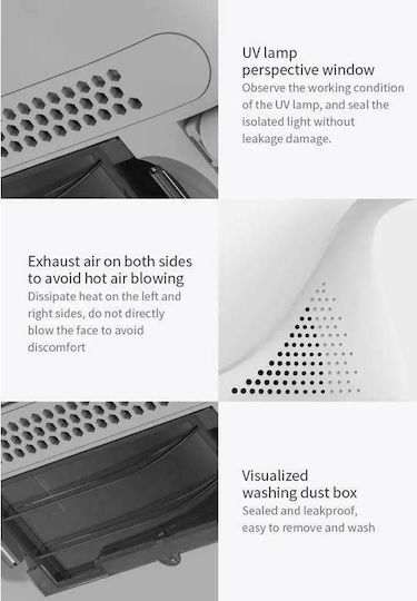 • Μια ειδική προστασία εξασφαλίζει ότι η λάμπα ενεργοποιείται μόνο σε επαφή με μια επίπεδη επιφάνεια, παρέχοντας έτσι προστασία UV και προστασία των ματιών. Υπάρχουν ειδικές γρίλιες εξαερισμού στο περίβλημα, οι οποίες διασφαλίζουν ότι η συσκευή διατηρεί τη σωστή θερμοκρασία χωρίς υπερθέρμανση.
