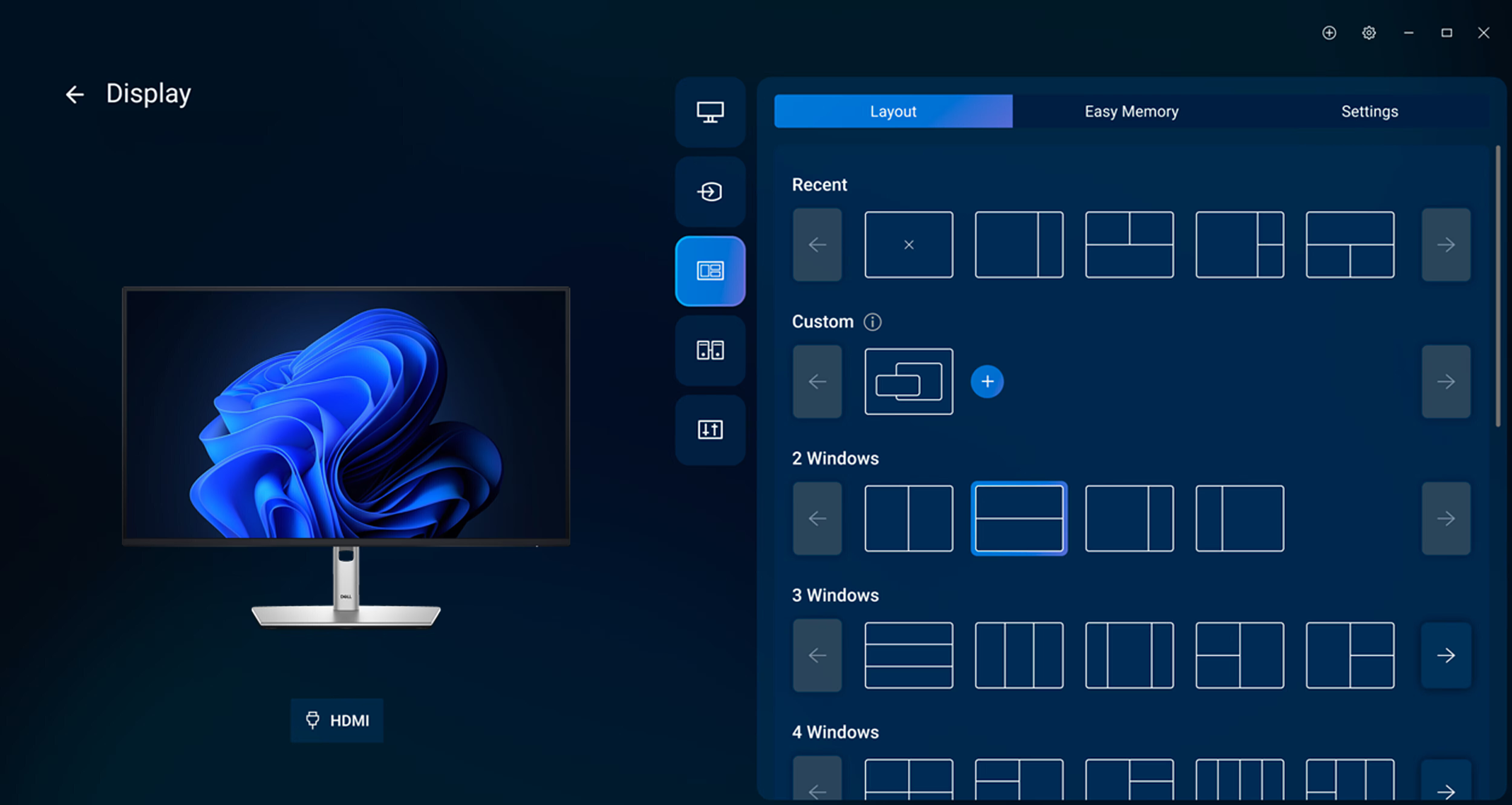 Easy Arrange τοποθετεί πλακάκια εφαρμογών σε διάφορες οθόνες με προκαθορισμένα χωρίσματα και προσαρμόζει έως και πέντε παράθυρα, ενισχύοντας την πολυδιεργασία. Το Easy Arrange Memory αποθηκεύει και επαναφέρει τα προφίλ εφαρμογών χειροκίνητα, με χρονοδιάγραμμα ή κατά την εκκίνηση.