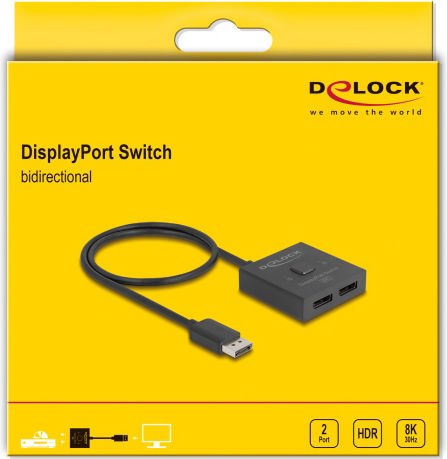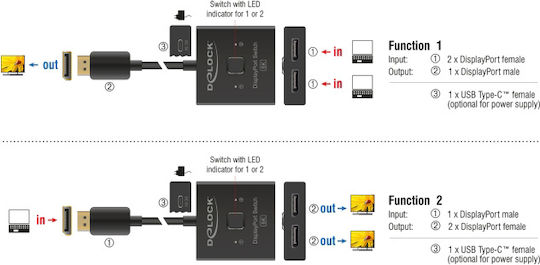 Αυτό το DisplayPort switch από τη Delock είναι ένα bidirectional switch για τη σύνδεση διαφορετικών συσκευών με υποδοχή DisplayPort. Μπορεί να χρησιμοποιηθεί για την σύνδεση μιας οθόνης σε δύο συσκευές με DisplayPort διεπαφή αλλά και για την σύνδεση δύο οθονών σε μια συσκευή με DisplayPort διεπαφή (δεν υποστηρίζει ταυτόχρονη προβολή εικόνας και στις 2 οθόνες).