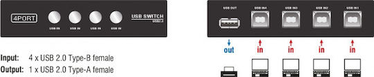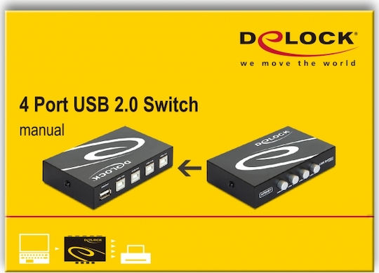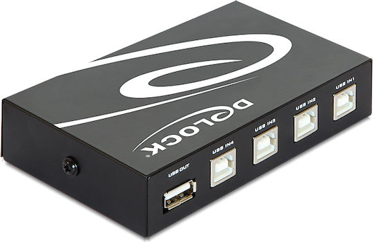Αυτή η διακλάδωση της Delock μπορεί να χρησιμοποιηθεί για σύνδεση μιας συσκευής USB σε τέσσερις υπολογιστές ή laptop. Στην διακλάδωση μπορούν να συνδεθούν π.χ. ένα HDD, εκτυπωτής, σαρωτής κτλ. Με τη χρήση ενός από τα τέσσερα κουμπιά, μπορεί χειροκίνητα να επιλέξει ποια συσκευή θα συνδεθεί στη συσκευή USB.