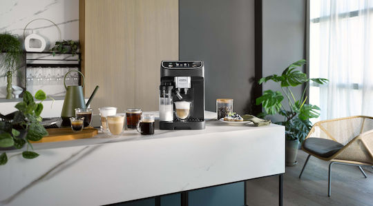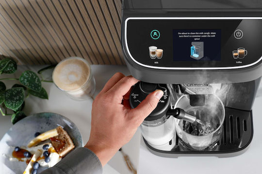 Το δοχείο νερού είναι αποσπώμενο, άρα προσφέρει εύκολο γέμισμα και καθαρισμό, και έχει χωρητικότητα 1.9 λίτρα. Αυτό σημαίνει ότι μπορεί να φτιάξει περίπου έως και 31 μονά φλυτζάνια ζεστού καφέ espresso, μέχρι να χρειαστεί να το ξαναγεμίσετε. Επίσης, διαθέτει δοχείο για τη χρήση φρέσκου γάλακτος, για τα ροφήματα με γάλα που προτιμάτε, όπως cappuccino, latte και άλλα. Το οποίο, όταν δεν χρησιμοποιείται, μπορεί εύκολα να αποθηκευτεί στο ψυγείο για να διατηρηθεί φρέσκο.
