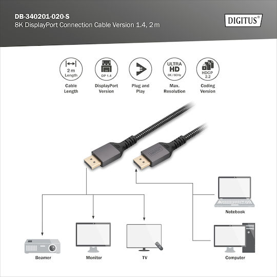 Το καλώδιο σύνδεσης Digitus® 8K DisplayPort 1.4 είναι σχεδιασμένο για μελλοντικές συσκευές υψηλής ανάλυσης. Υποστηρίζει αναλύσεις Ultra-HD II έως 7680 x 4320 pixel και έχει ρυθμό δεδομένων 32,4 Gbps. Το καλώδιο διαθέτει βύσμα DisplayPort σε DisplayPort, κατάλληλο για επιτραπέζιους υπολογιστές, φορητούς υπολογιστές και κάρτες γραφικών.