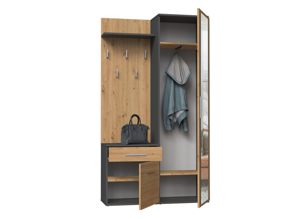 Η ντουλάπα εισόδου DUO διαθέτει καθρέφτη και είναι σχεδιασμένη για να σας προσφέρει άνεση και λειτουργικότητα. Περιλαμβάνει: