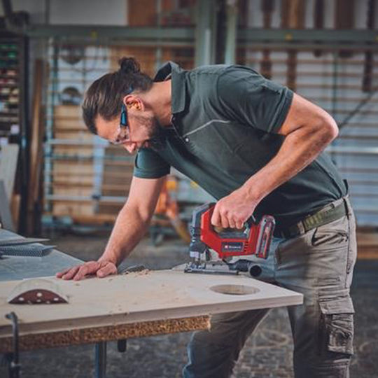 Σέγα της εταιρείας Einhell, με λειτουργία μπαταρίας 18V (δεν περιλαμβάνεται). Χρησιμοποιείται για κοπές με μεγάλη ακρίβεια σε υλικά όπως το ξύλο, το μέταλλο και το αλουμίνιο και λόγω του χαμηλού βάρους της (2.1Kg) μπορεί να χρησιμοποιηθεί με το ένα χέρι. Έχει δυνατότητα προσαρμογής της ταχύτητας έως 3500rpm. Ενσωματωμένο φωτάκι LED για φωτισμό του χώρου εργασίας. Μπορεί να κόψει ξύλο μέχρι 135mm και μέταλλο μέχρι 10mm.