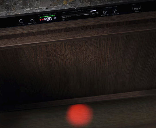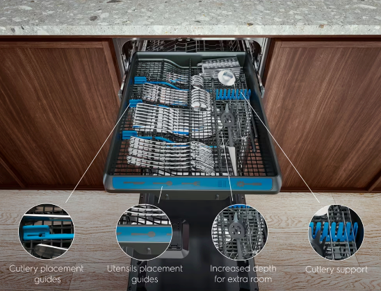 ✔ Το ευρύχωρο συρτάρι MaxiFlex χωράει μαχαιροπίρουνα και κουζινικά κάθε σχήματος, ενώ η φωτεινή ένδειξη στο πάτωμα σε ενημερώνει σιωπηλά για την πρόοδο της πλύσης.