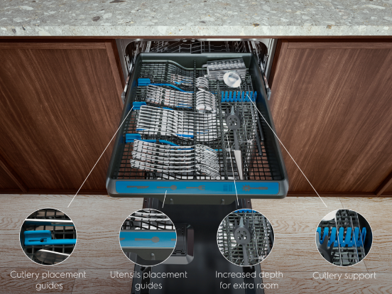 Το συρτάρι MaxiFlex είναι σχεδιασμένο να χωράει μαχαιροπίρουνα και μαγειρικά εργαλεία σχεδόν όλων των σχημάτων και των μεγεθών. Είτε είναι μεγάλα ή με περίεργο σχήμα, με τα ρυθμιζόμενα διαχωριστικά και το βάθος του συρταριού μπορείτε να φορτώσετε τα πάντα με ευκολία.