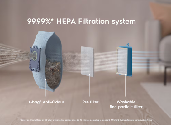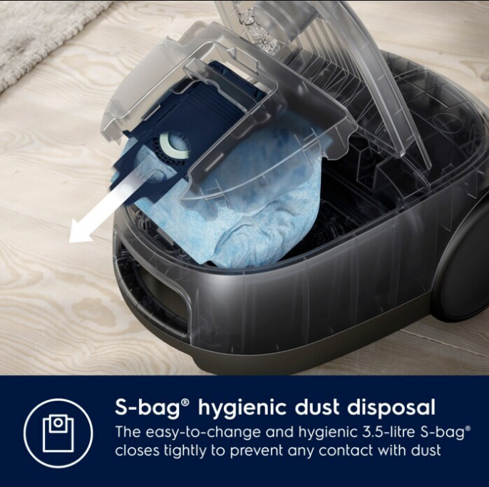 - S-bag™ Anti-odour: Η ειδική αντιοσμική σακούλα σκόνης απορροφά τις δυσάρεστες οσμές και η ηλεκτρική σας σκούπα εκπέμπει φρέσκο και καθαρό αέρα.