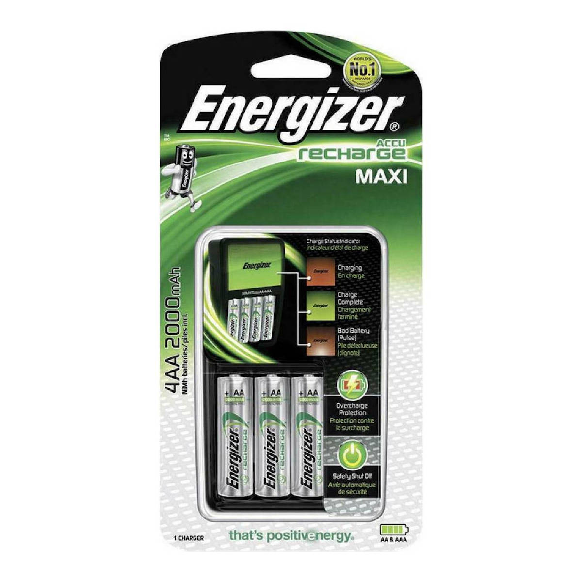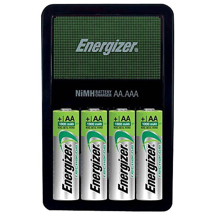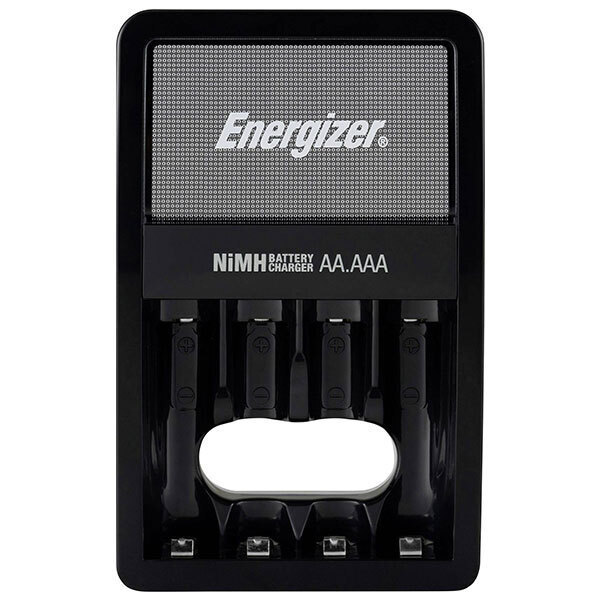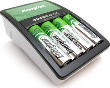 Φορτιστής μπαταριών Energizer Maxi με 4 επαναφορτιζόμενες μπαταρίες ΑΑ. Χρειάζεται 10 ώρες για πλήρη φόρτιση των τεσσάρων μπαταριών και έχει και ενδεικτική λυχνία διαδικασίας φόρτισης, πλήρης φόρτισης και μη έγκυρης μπαταρίας.