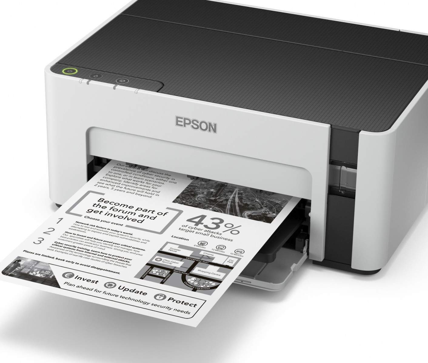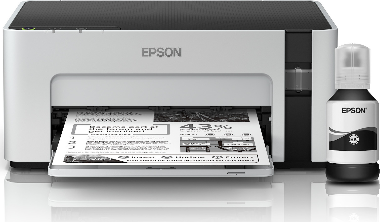 Με τον εκτυπωτή EcoTank, μπορείτε να εξοικονομήσετε έως και 50% σε τρία χρόνια σε σύγκριση με τους ασπρόμαυρους εκτυπωτές laser. Διαθέτει μεγάλο αναπληρούμενο δοχείο μελανιού, για να το γεμίζετε με τα συμπεριλαμβανόμενα φιαλίδια μελανιού αντί για γραφίτη.