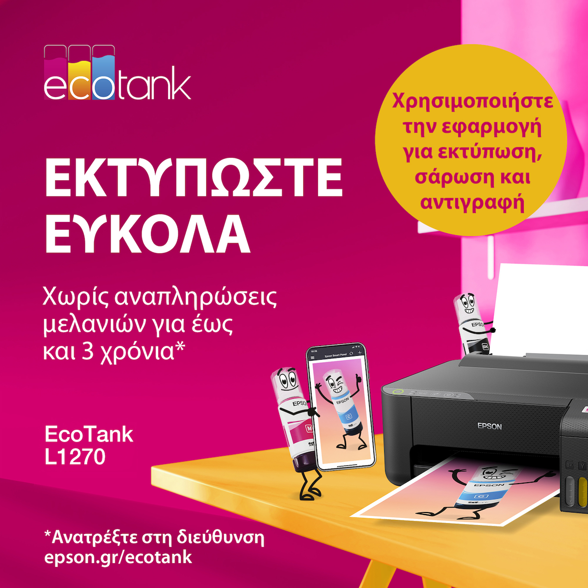 Εξοικονομήστε έως 90% στο κόστος εκτύπωσης με τους εκτυπωτές EcoTank της Epson χωρίς φύσιγγες μελανιών. Συμπεριλαμβάνονται φιαλίδια μελανιών υψηλής απόδοσης, ενώ τα ενσωματωμένα δοχεία μελανιών μπορούν να γεμίσουν εύκολα χάρη στα ειδικά σχεδιασμένα φιαλίδια.