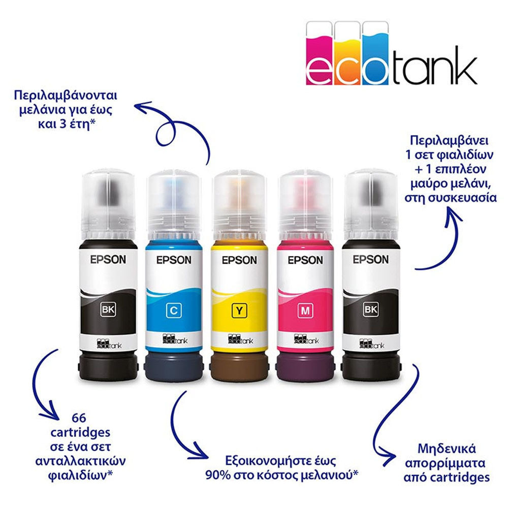 Αυτός ο οικονομικός εκτυπωτής μειώνει το κόστος εκτύπωσης έως 90%* και περιλαμβάνει στη συσκευασία μελάνι που καλύπτει τις ανάγκες σας για έως 3 έτη*. Εκτυπώστε έως 8.100 ασπρόμαυρες και 6.500 έγχρωμες σελίδες* με το αρχικό μελάνι, ενώ το σετ ανταλλακτικών φιαλιδίων μελανιού αντιστοιχεί σε έως 66 cartridges*
