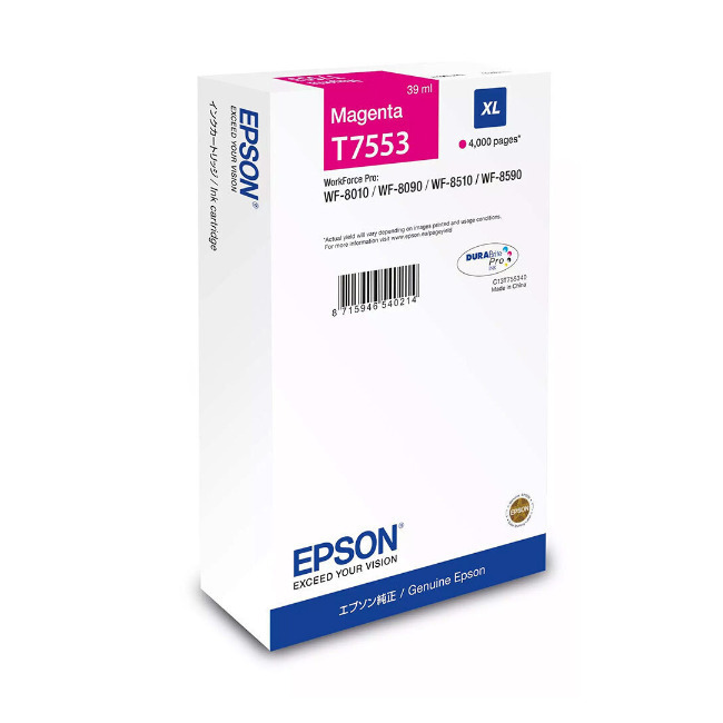 Γνήσιο μελάνι Ink Epson DURABrite C13T75534N σε χρώμα Magenta, μέγεθος XL 39ml. Ικανότητα εκτύπωσης έως 4.000 σελίδες.