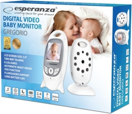 Συσκευή παρακολούθησης μωρού, με LCD οθόνη 2.0″, αποτελεσματική εμβέλεια 50m σε εσωτερικούς χώρους και 260m σε εξωτερικούς χώρους. Είναι εξοπλισμένη με αυτόματη λειτουργία νυχτερινής όρασης, λειτουργία αμφίδρομης ομιλίας, παρακολούθηση θερμοκρασίας δωματίου και 8 ενσωματωμένα νανουρίσματα.
