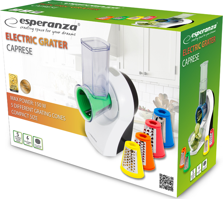 Ο ηλεκτρικός τρίφτης της Esperanza είναι ιδανικός για την άλεση φρούτων, λαχανικών, τυριού, σοκολάτας και ξηρών καρπών. Πέντε αντικαταστάσιμα μαξιλάρια τριβής επιτρέπουν το σχήμα και το πάχος των τεμαχισμένων προϊόντων να προσαρμόζονται στις ανάγκες του πιάτου. Το μικρό μέγεθος και η κομψή εμφάνιση αποτελούν επιπλέον πλεονεκτήματα αυτής της πολύ πρακτικής συσκευής, κατάλληλης για κάθε κουζίνα.