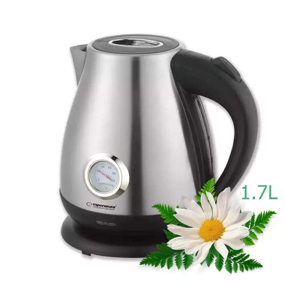 Ο βραστήρας, από την εταιρία Esperanza, είναι κατασκευασμένος από ανοξείδωτο ατσάλι υψηλής ποιότητας. Εξοπλισμένος με ενσωματωμένο θερμαντικό στοιχείο και μη θερμαινόμενη λαβή, για ευκολία και υψηλή άνεση στη χρήση. Έχει χωρητικότητα 1.7 Lt, ενσωματωμένο θερμόμετρο, αυτόματο κλείσιμο μετά τον βρασμό του νερού και προστασία από το βράσιμο χωρίς νερό.