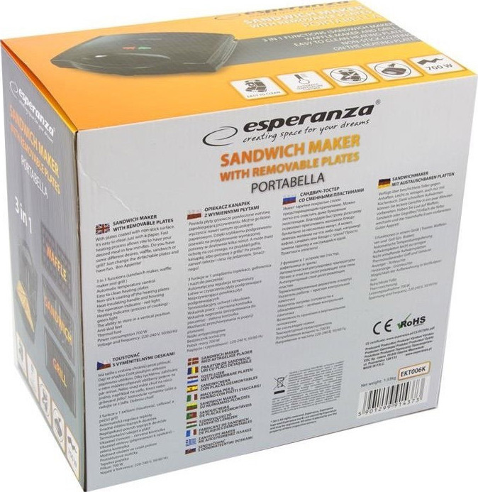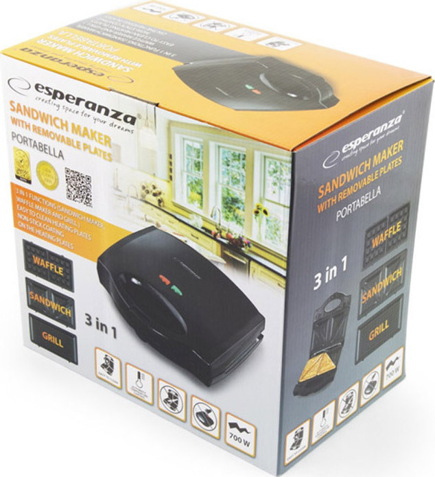 Η τοστιέρα, από την εταιρία Esperanza, έχει ισχυρή ισχύ 700 W και 3 διαφορετικές αφαιρούμενες αντικολλητικές πλάκες, για τοστ, βάφλες και ψήσιμο στο grill. Επιπλέον, είναι εξοπλισμένη με αυτόματο έλεγχο της θερμοκρασίας, μη θερμαινόμενη λαβή με κλιπ κλεισίματος και αντιολισθητική βάση για μέγιστη σταθερότητα.