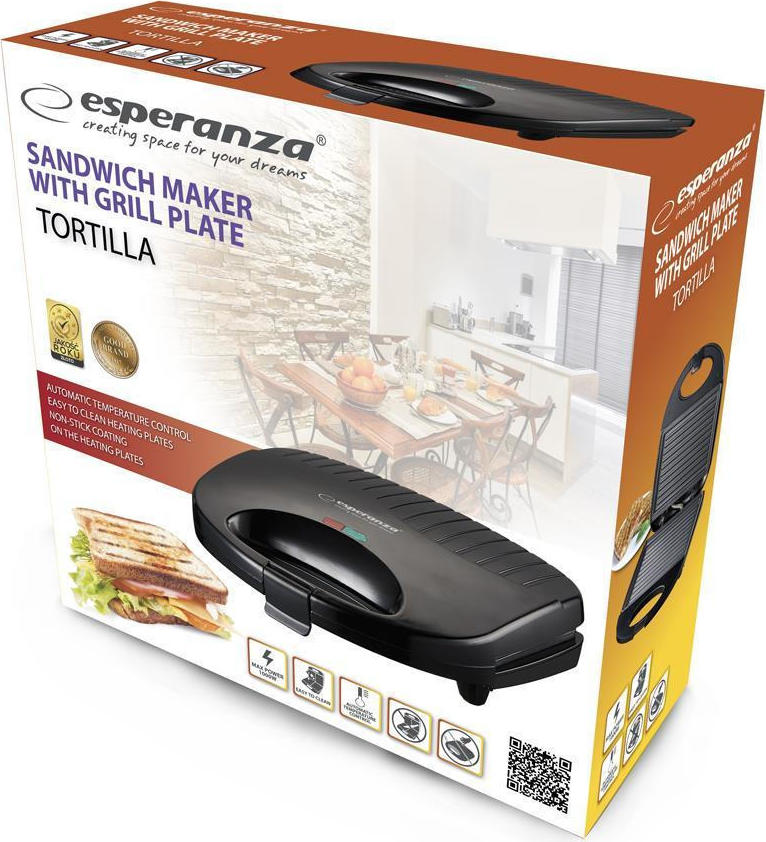 Τοστιέρα σαντουιτσιέρα,γκριλιέρα ,αντικολλητικών κεραμικών πλακών,2 Θέσεων της Esperanza. Μπορεί να καθαριστεί πολύ εύκολα ενώ ζεσταίνει πολύ γρήγορα για γρήγορη ετοιμασία των γευμάτων. Η μεγάλη απόσταση μεταξύ των πλακών επιτρέπει την τοποθέτηση ακόμα και μεγάλων κομματιών κρέατος.