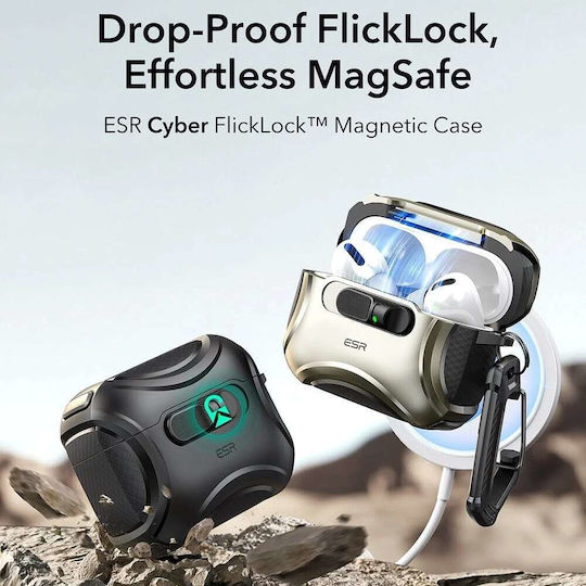 Ανθεκτική θήκη Airpods Cyber Armor από την ESR για τα AirPods Pro 3. Είναι κατασκευασμένη από ανθεκτική σιλικόνη, προσφέροντας προστασία και αντοχή στο χρόνο. Η θήκη αυτή είναι ελαφριά και διαθέτει ειδική θύρα για καλώδιο φόρτισης, ενώ υποστηρίζει και ασύρματη φόρτιση μέσω τεχνολογίας Magsafe. Περιλαμβάνει επίσης ένα ειδικό κλιψάκι για εύκολη προσαρμογή σε μπρελόκ, κλειδιά, τσάντα ή στο παντελόνι.