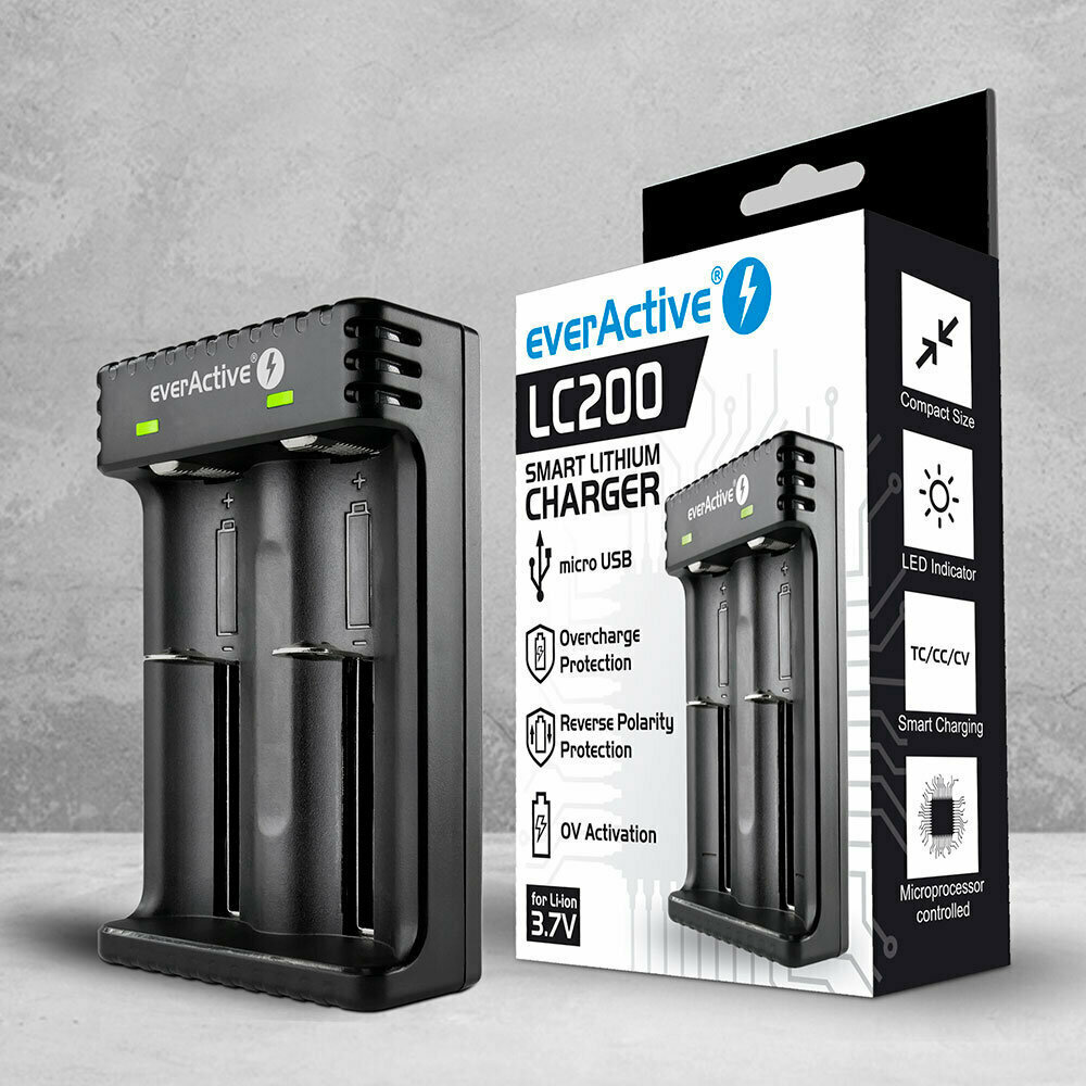 Ο φορτιστής everActive LC-200 μπορεί να τροφοδοτηθεί από οποιοδήποτε τροφοδοτικό USB (5V/2A), καθώς και από φορτιστή κινητού τηλεφώνου με βύσμα micro USB. Περιλαμβάνεται καλώδιο micro USB 0.5 m.