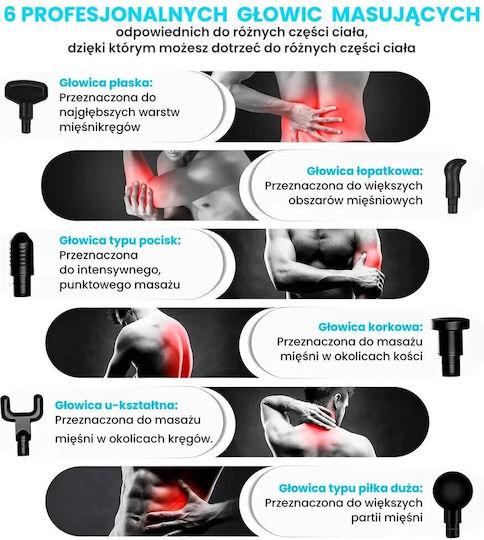 Η Extralink Massage Gun Lite διαθέτει 6 εναλλασσόμενα ακροφύσια που επιτρέπουν την προσαρμογή της για διαφορετικές ανάγκες μασάζ. Μπορείτε να επιλέξετε το ακροφύσιο που ταιριάζει καλύτερα στο μασάζ διαφόρων περιοχών του σώματος ή που έχει συγκεκριμένα λειτουργικά οφέλη.
