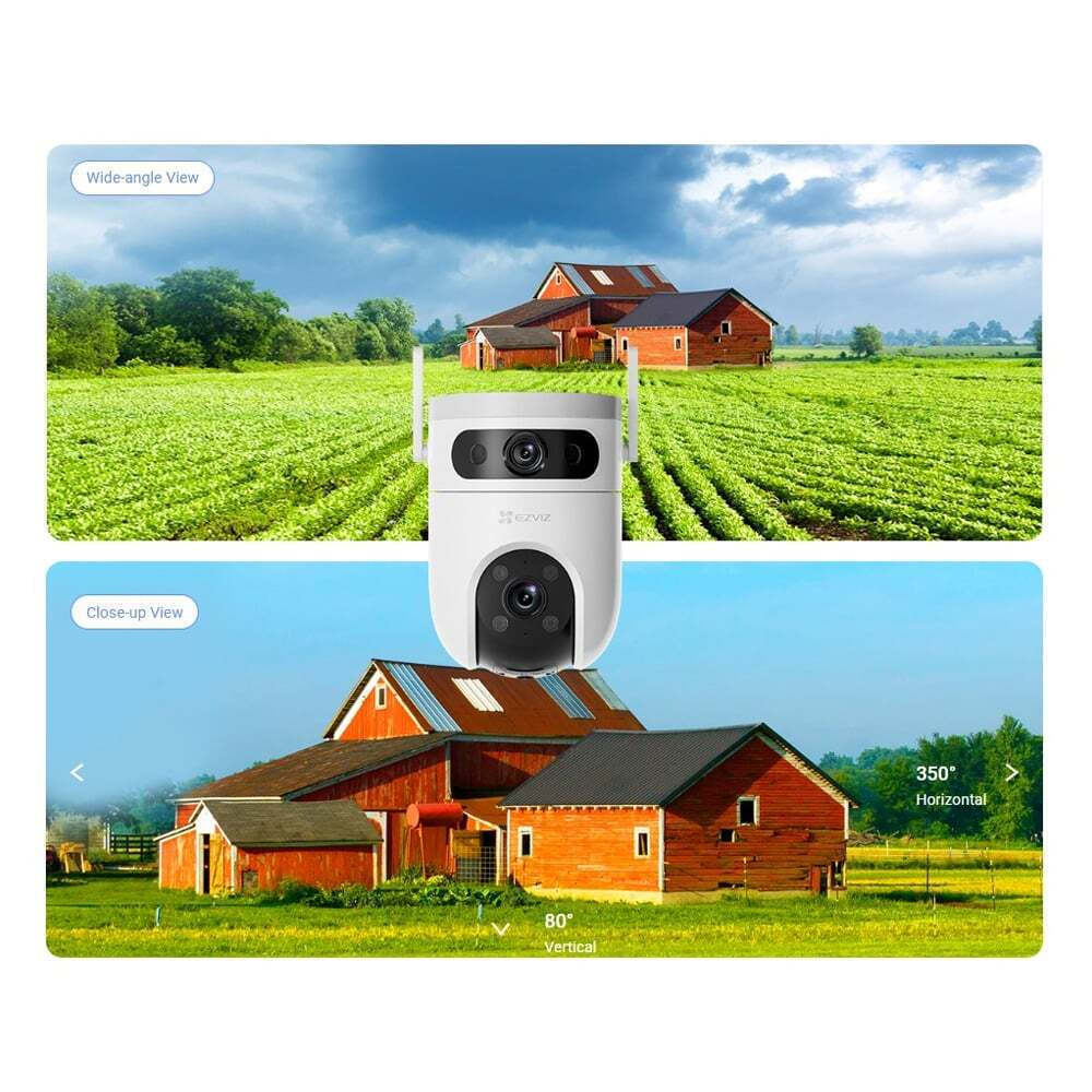 Με τη μοναδική τεχνολογία διπλού φακού η EZVIZ H9c παρέχει απαράμιλλη προστασία. Χρησιμοποιεί έναν ευρυγώνιο φακό πάνω από έναν τηλεφακό με δυνατότητα πανοραμικής κλίσης. Το δίδυμο λειτουργεί ανεξάρτητα ή μαζί, με έναν τρόπο που είναι αποτελεσματικότερος από μία απλή κάμερα παρακολούθησης.