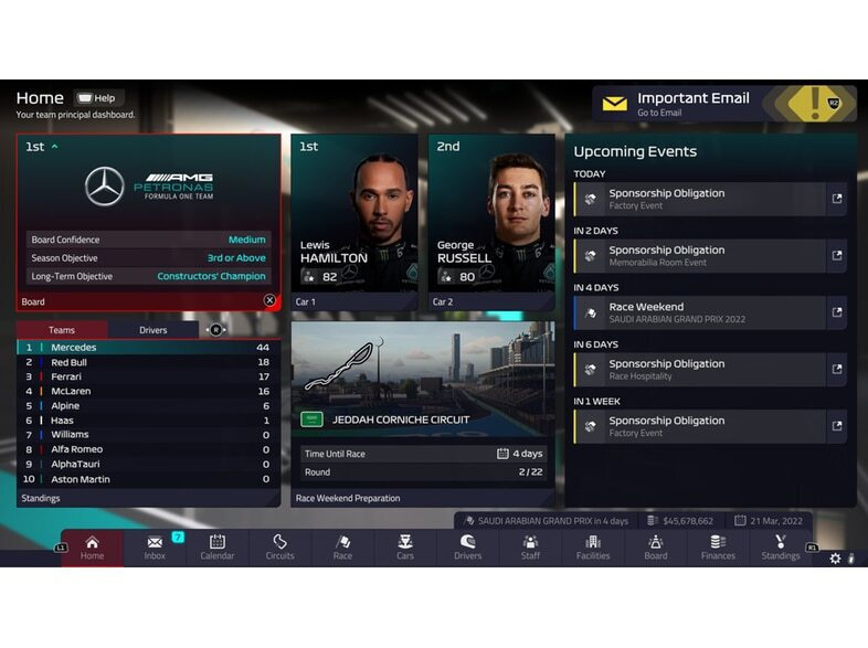 Γράψτε ένα νέο κεφάλαιο σε μια τολμηρή νέα εποχή για τη Formula 1. Επιλέξτε την ομάδα σας F1 και οδηγήστε την στη δόξα σε όλους τους επίσημους αγώνες του 2022 ξεκινώντας το ταξίδι σας στο πίσω μέρος του grid ή παίρνοντας τη θέση σας στην pole position – στο F1 Manager, η επιλογή είναι δική σας. Ο στόχος σας είναι να εντυπωσιάσετε το ταμπλό πετυχαίνοντας τους στόχους της σεζόν και τους μακροπρόθεσμους στόχους σας, διασφαλίζοντας την επιτυχία της ομάδας σας για τα επόμενα χρόνια