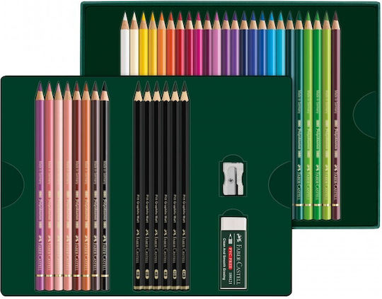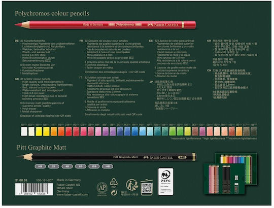 Το σετ περιλαμβάνει: 32 Μολύβια Πολύχρωμα (#101 Λευκό, #107 Κανελλί κίτρινο, #111 Κανελλί πορτοκαλί, #112 Φυλλώδες πράσινο, #131 Κοραλλί, #133 Μαγέντα, #119 Ανοιχτό μαγέντα, #145 Ανοιχτό φθοριούχο μπλε, #144 Κοράλλι μπλε πράσινο, #159 Πράσινο του Χούκερ, #160 Μαγγανέση βιολέτα, #177 Καφέ καρυδιάς, #187 Ψημένο όχρα, #192 Ινδικό κόκκινο, #199 Μαύρο, #219 Σκοτεινό Κοκκινωπό Κόκκινο, #103 Ελεφαντόδοντο, #108 Σκούρο κανέλλι κίτρινο, #115 Σκούρο κανέλλι πορτοκαλί, #142 Μάττερ, #123 Φούξια, #135 Ανοιχτό κόκκινο-βιολέτα, #138 Βιολέτα, #143 Κοράλλι μπλε, #154 Ανοιχτό κοράλλι τυρκουάζ, #158 Σκοτεινό κοράλλι πράσινο, #132 Ροζ μπεζ, #170 Πράσινο Μάης, #189 Κανέλα, #166 Πράσινο γρασιδιού, #247 Ιντανθρέν μπλε και #263 Κεφάλι Θνητού βιολέτα), 6 μολύβια γραφίτη Pitt Matte HB, 2B, 4B, 6B, 10B και 14B, 1 αδρανές βινυλικό σβήστη και 1 μεταλλικό ξύστη με μία τρύπα σε κουτί δώρου.