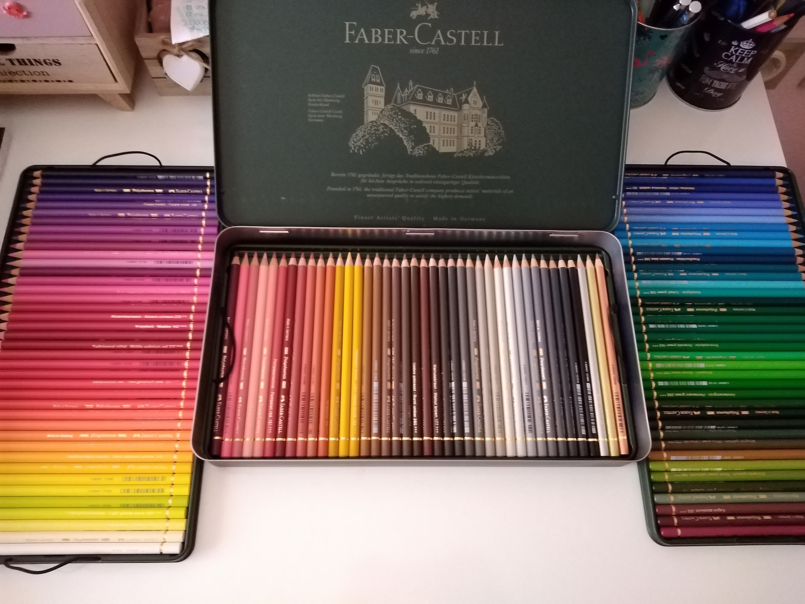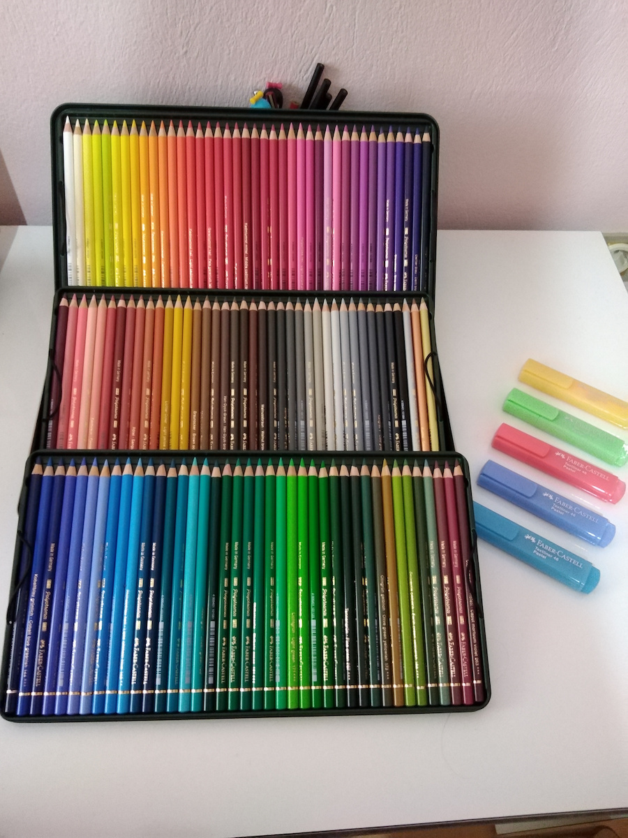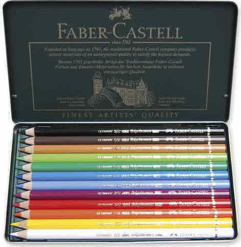 Οικολογικές ξυλομπογιές της σειράς Polychromos της Faber-Castell σε μεταλλική κασετίνα των 12 τεμαχίων.
