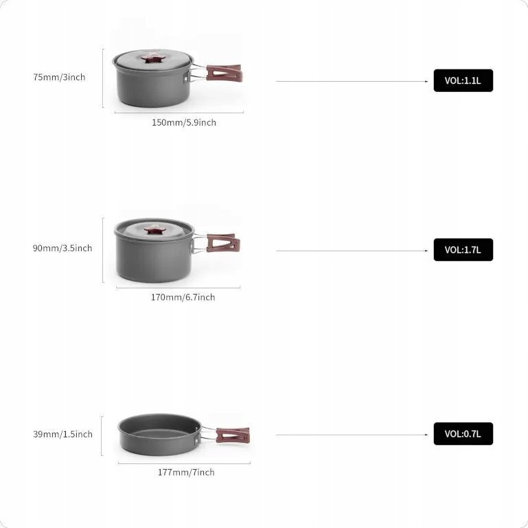 - Επιπλέον σκεύη: Περιλαμβάνει κατσαρόλες και τηγάνια με συγκεκριμένες χωρητικότητες και διαστάσεις.