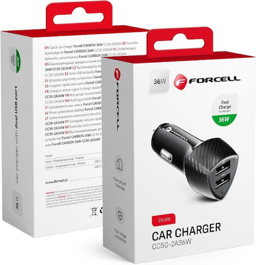 Forcell Φορτιστής Αυτοκινήτου 36W 3A Γρήγορης Φόρτισης με Θύρες: 2xUSB Μαύρος CC50-2A